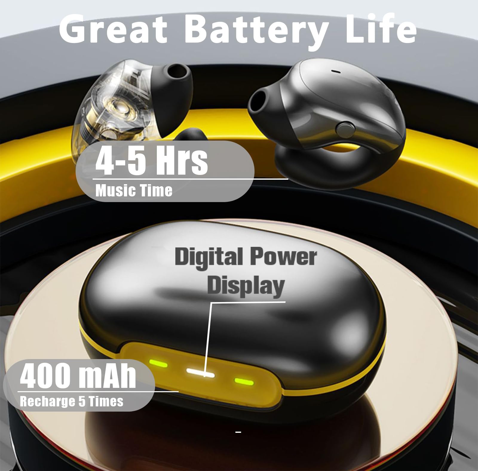 - 《5 Hours Play & Suitable for the Crowd》 Open ear Earbuds clip on Bone conduction headphones bluetooth USB charging and include 400mAh battery, enjoy 5 hours of non-stop music or podcasts,Suitable for people who like outdoor sports, such as running, hiking, cycling, etc.; Open ear headphones are suitable for wearing headphones all day long, need to protect their hearing.