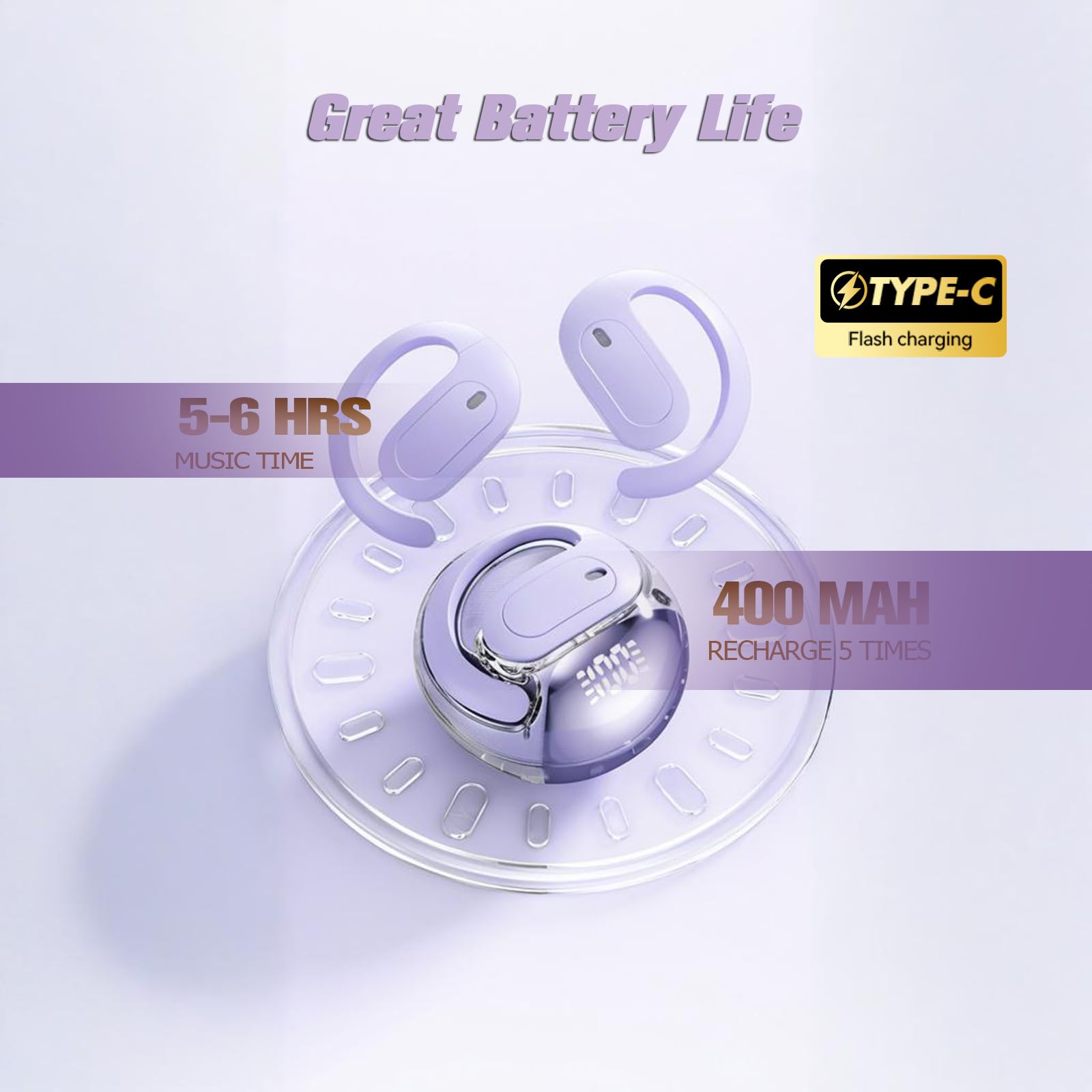 - 4-5(20-30) Hours Play: Wireless earbuds open ear Bone air conduction headphones USB charging and include 400mAh battery, enjoy 4-5(20-30) hours of non-stop music or podcasts,bluetooth headphones open ear outside the ear headphones open ear with mic Built-in microphone achieves clearer phone call